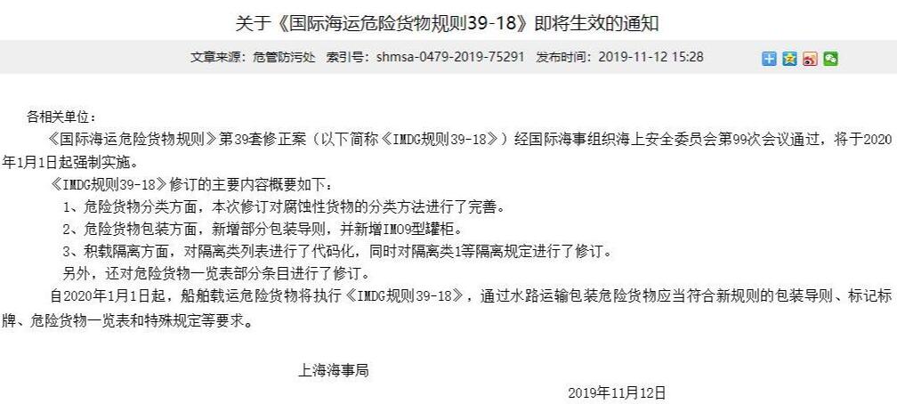 《國際海運危險貨物規則》第39套修正案(以下簡稱《IMDG規則39-18》)經國際海事組織海上安全委員會第99次會議通過,將于2020年1月1日起強制實施。
